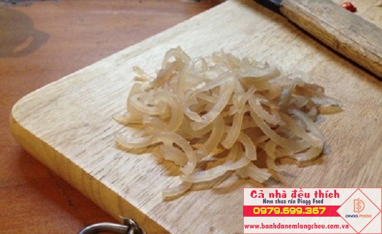 Bước 1 : Bắc 1 nồi nước lên bếp rồi đun sôi, đến khi sôi thì cho bì lợn vào luộc chín. Đến khi bì lợn đã chín thì vớt ra, dùng dao thái thành những lát mỏng và cho vào bát.